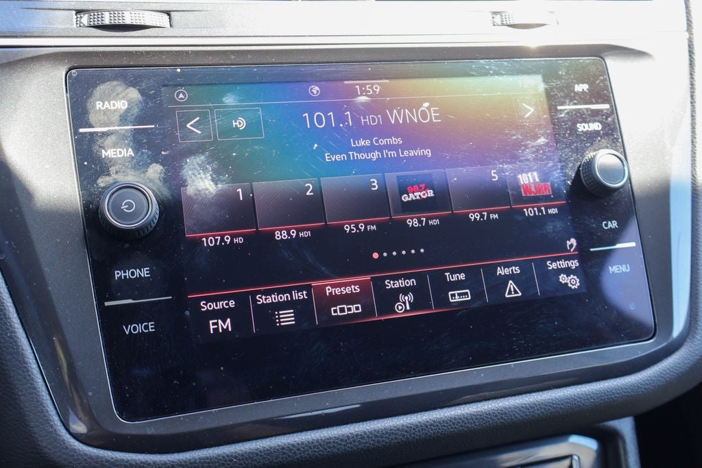 - Radio: MIB3 Composition Media AM/FM/HD -inc: 8" touchscreen, WMA/MP3/FLAC player w/USB-C, voice control, 6-speaker sound system, capability for in-vehicle 4G LTE enabled Wi-Fi (cellular data plan required; includes limited trial), capability for VW Car-Net services (capabilities for certain services vary; requires enrollment or subscription), Bluetooth® connectivity (for compatible devices), SiriusXM w/360L (w/3-month free trial subscription; 360L services require acceptance of Car-Net terms), App-Connect smartphone integration (w/Apple CarPlay, Android Auto and MirrorLink) via USB, Wireless App-Connect smartphone integration (for compatible devices) w/multi-phone pairing capability, 45W fast charging (for compatible mobile phones and accessories) via USB in first and second rows and Qi wireless inductive charger (for compatible mobile phones and accessories)